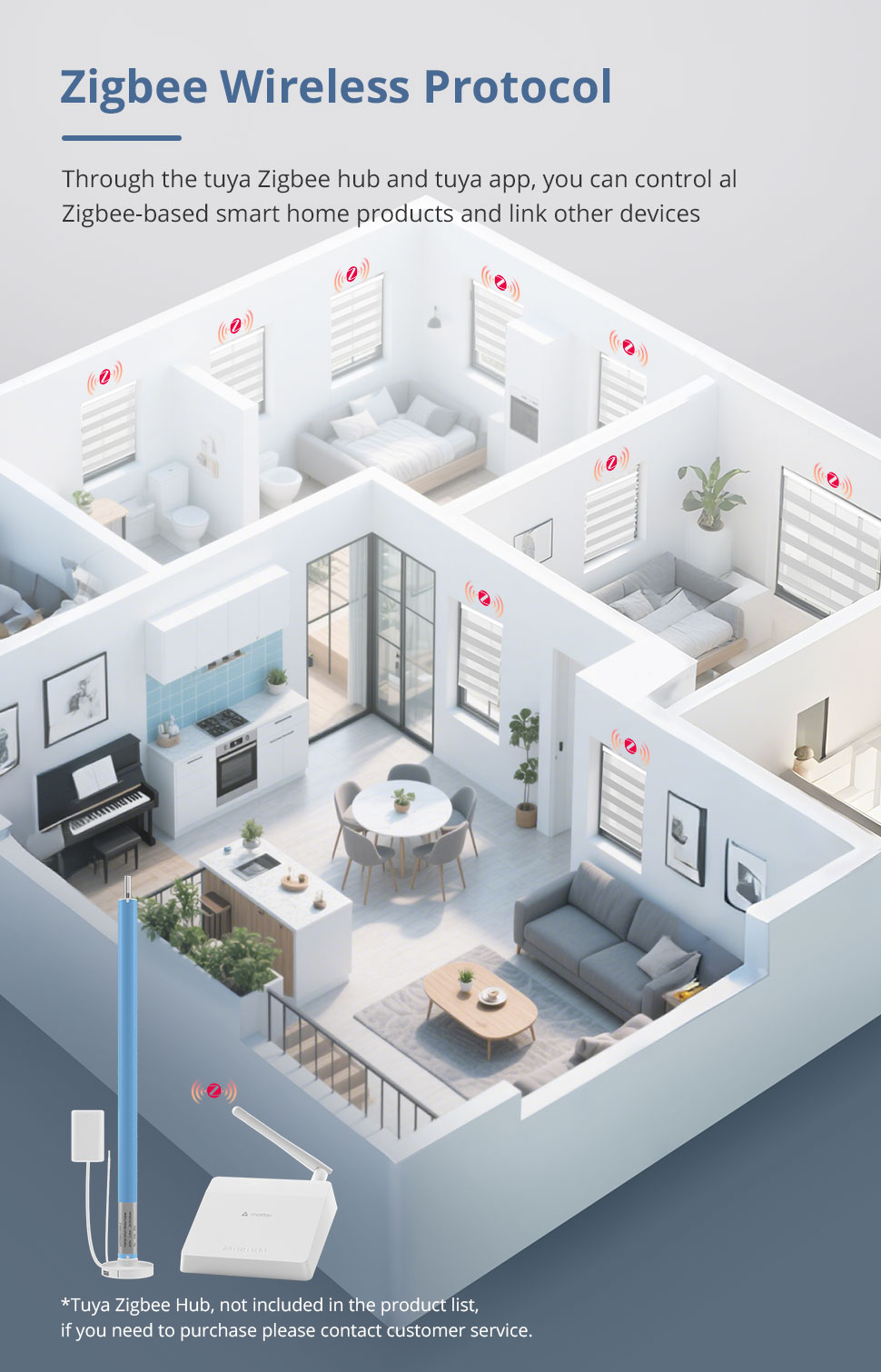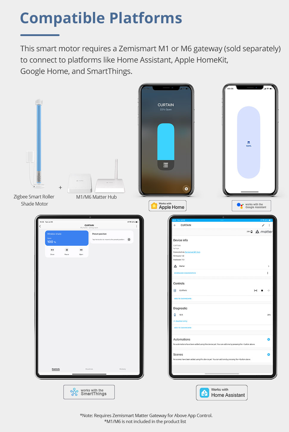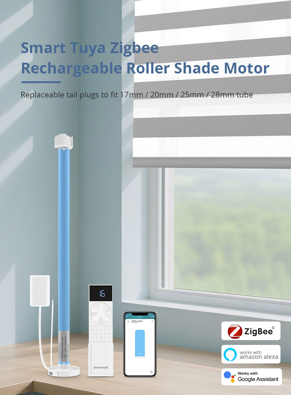 Matter-enabled smart blind motor (via Zemismart Matter Hub M1/M6), compatible with Google Home, Apple HomeKit, Alexa, SmartThings, and Home Assistant. Requires a Tuya Zigbee Hub to connect with the Tuya Smart / Smart Life App. Fits 17/20/25/28mm tubes and features a built-in 800mAh rechargeable battery for stable operation.