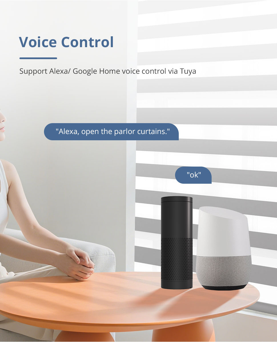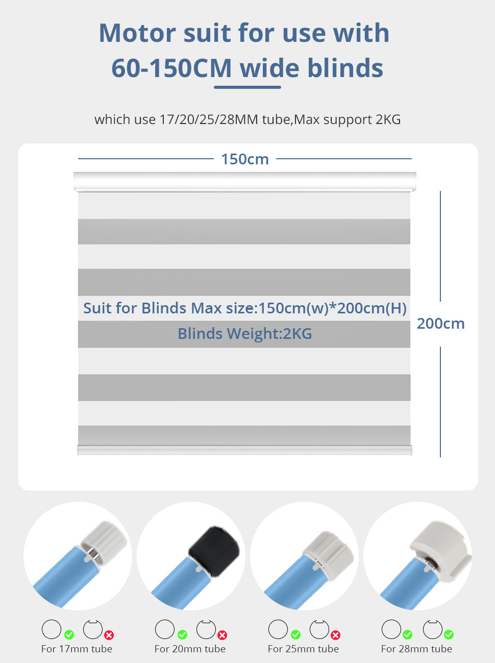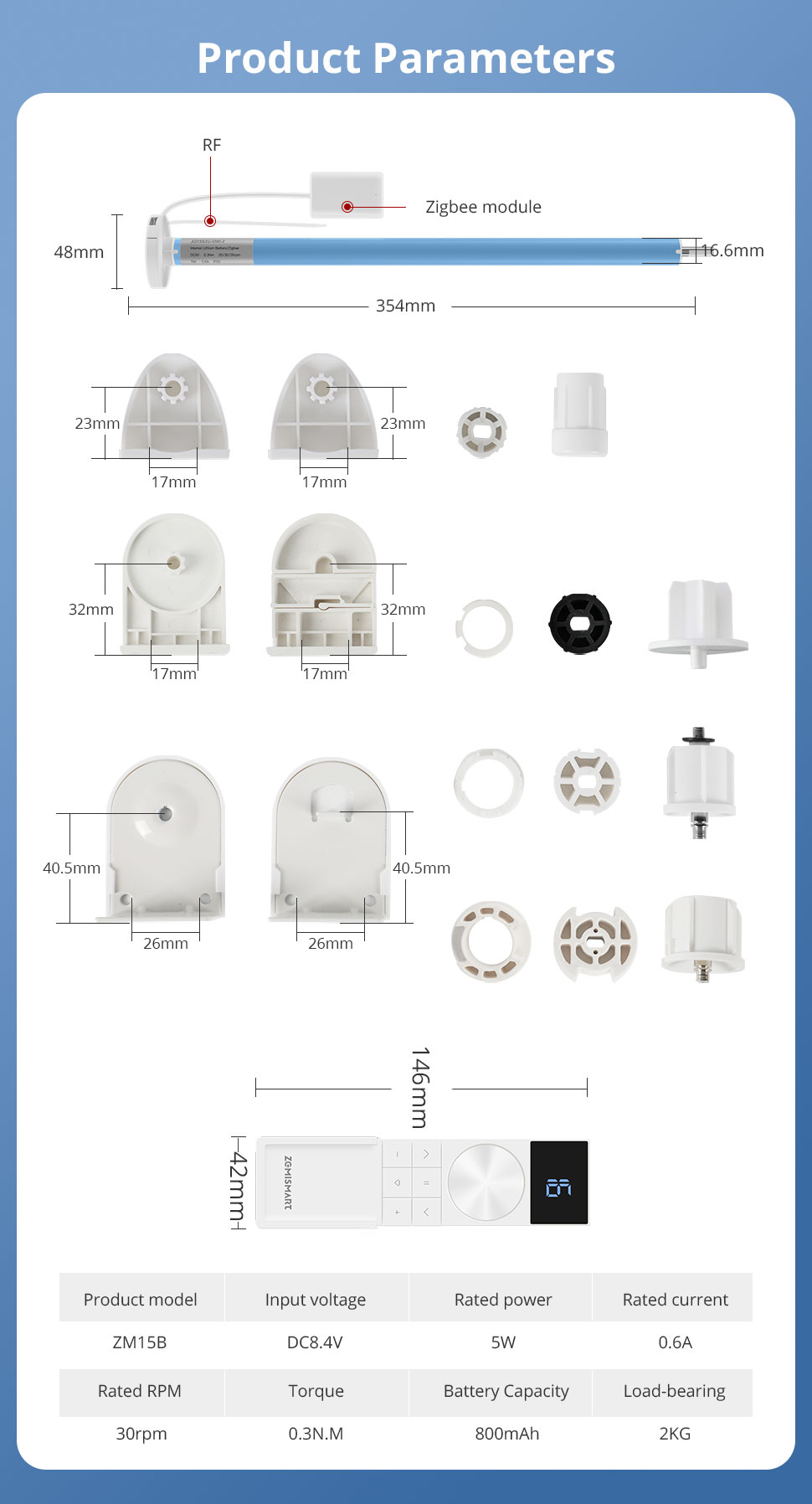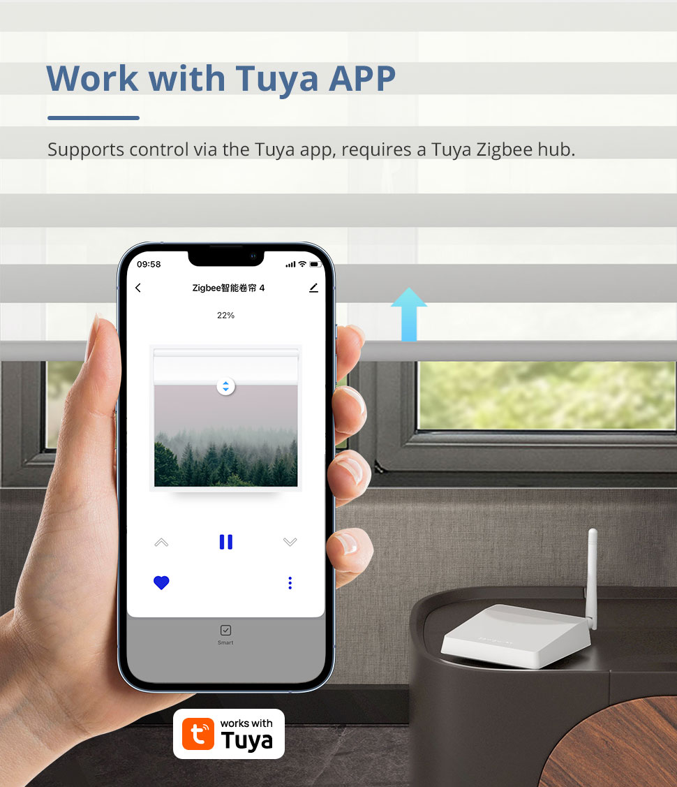 Matter-enabled smart blind motor (via Zemismart Matter Hub M1/M6), compatible with Google Home, Apple HomeKit, Alexa, SmartThings, and Home Assistant. Requires a Tuya Zigbee Hub to connect with the Tuya Smart / Smart Life App. Fits 17/20/25/28mm tubes and features a built-in 800mAh rechargeable battery for stable operation.